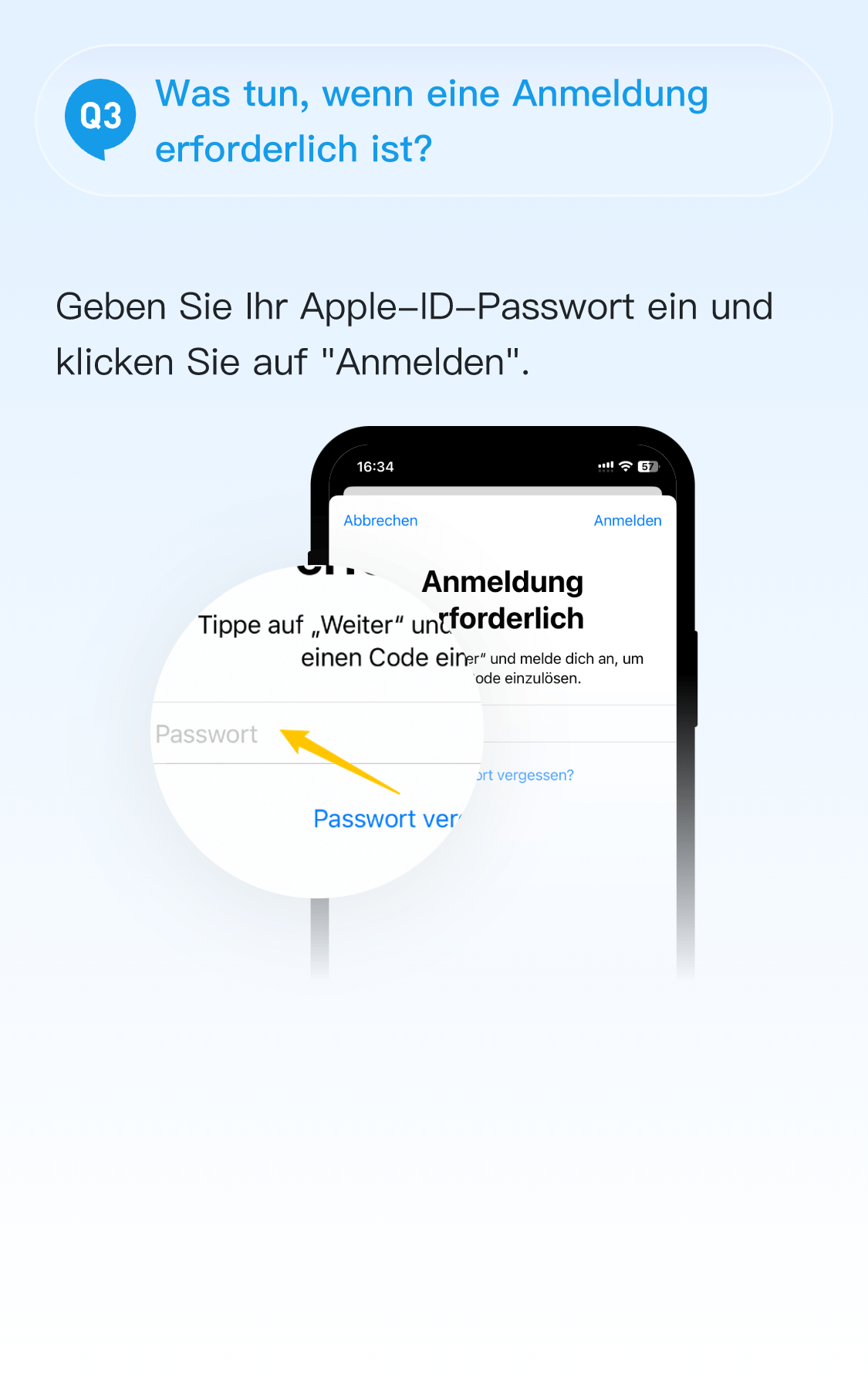 A: Geben Sie ein Passwort ein, das mit Ihrer AppleID übereinstimmt.