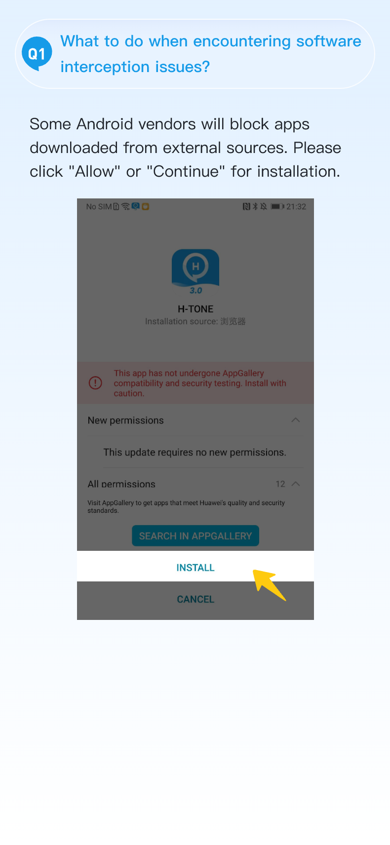 Some Android vendors will block apps downloaded from external sources. We will solve this problem as soon as possible. When you encounter this problem, please touch "Allow" or "Continue" for installation.